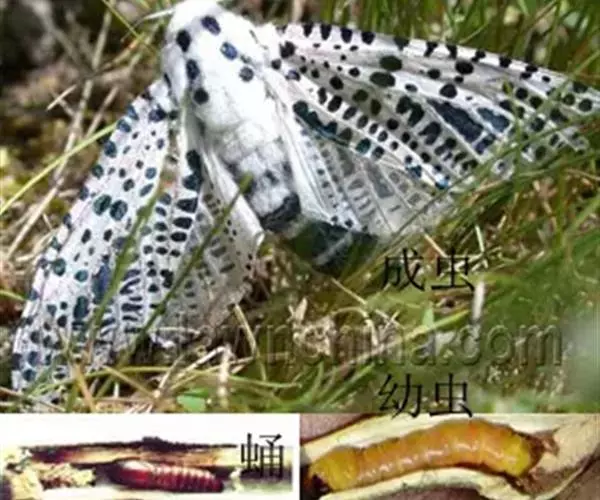多斑豹蠹蛾的成虫灰白色,体长29毫米,翅展55—61毫米。头、胸部都密被灰色短毛。雌虫触角丝状白色,末端黑色。雄虫触角基半部羽毛状,端半部线状。幼虫体长35—45毫米,头部黑褐色。胸、腹部红褐色,体粗壮,各节有数个小黑点,黑点上着生一根毛。寄主植物主要有核桃、苹果、枣、柿、杨树等。幼虫蛀食1——3年生枝干皮层和木质部,破坏输导组织,引起枝干枯死,树势衰弱,产量减少。