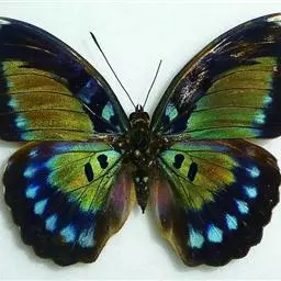 天堂凤蝶翅展可达105mm。前、后翅自基角至后缘约1/2~2/3端为纯净的宝蓝色,后角至后缘1/3…
