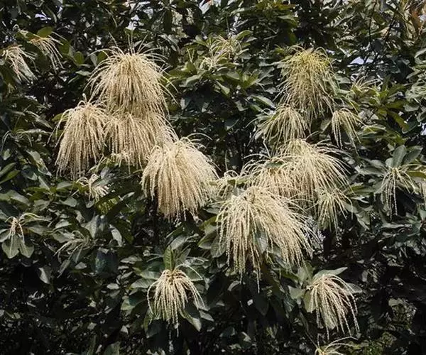 雄花多为圆锥花序,花序轴无毛。果序长8-18厘米。壳斗被暗红褐色粉末状蜡鳞,小苞片鳞片状,三角形或四边形,幼嫩时覆瓦状排列,成熟时多退化并横向连接成脊肋状圆环,成熟壳斗圆球形或宽椭圆形,顶部稍狭尖,通常全包坚果,壳壁厚0.5-1毫米,不规则的2-3(-4)瓣裂,裂瓣常卷曲。