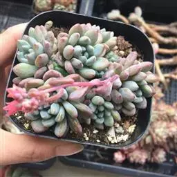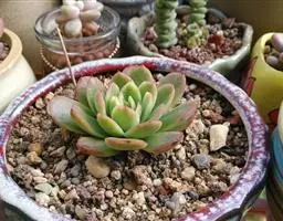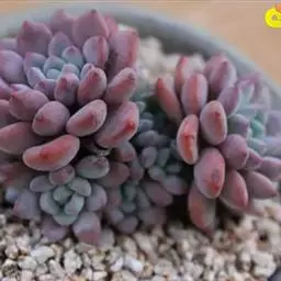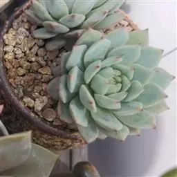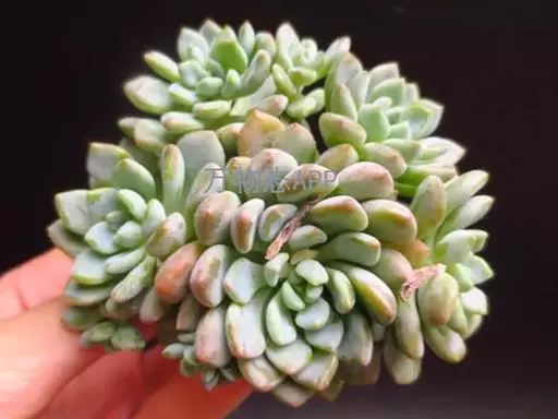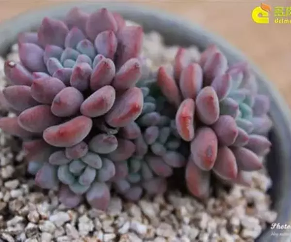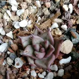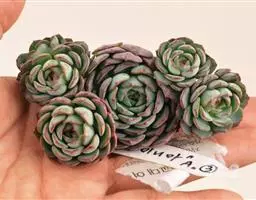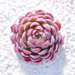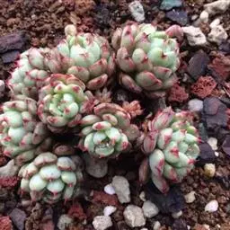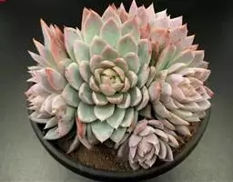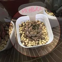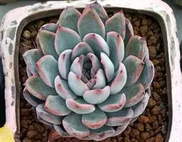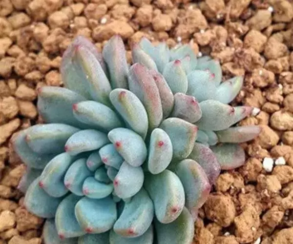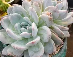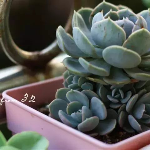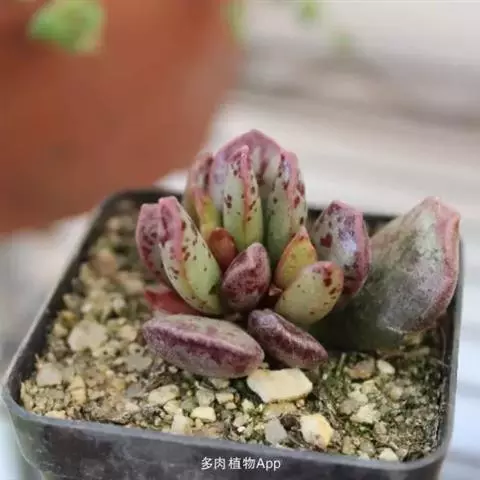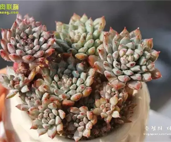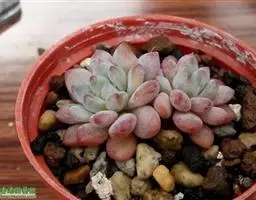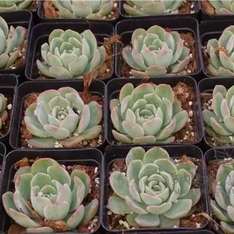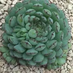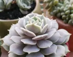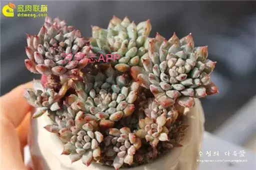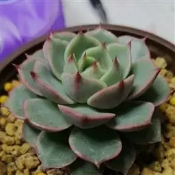 花乃井拟石莲花属多肉植物,植株小型或微型,直径在3-5厘米,叶片肉质肥厚,匙形,有短柄或无柄,轮生,排列紧密,形成莲座状,蓝绿色、或紫色、粉红色,叶片有白粉,叶端钝圆,有小尖,或几乎无尖。易生侧芽,从植株底部长出,容易长成群生株,花期春季。