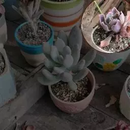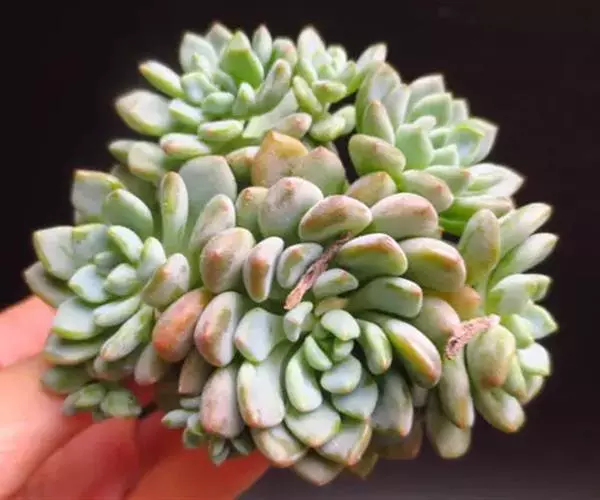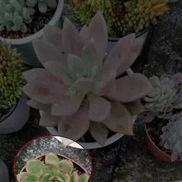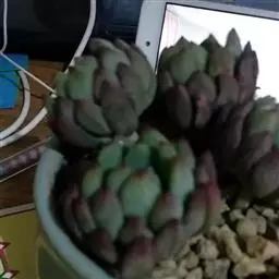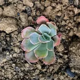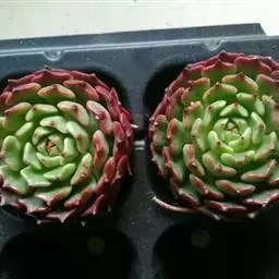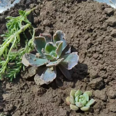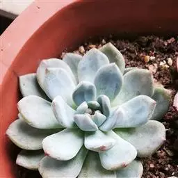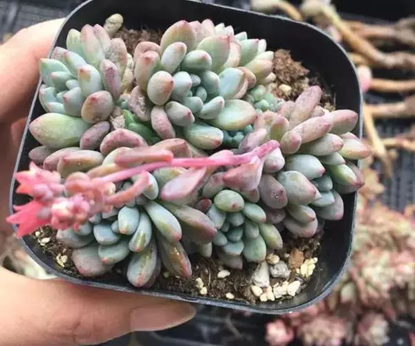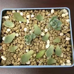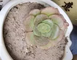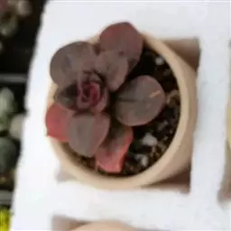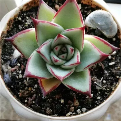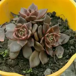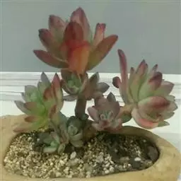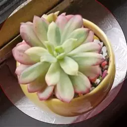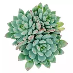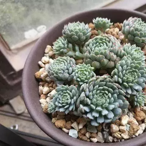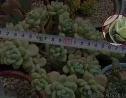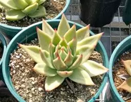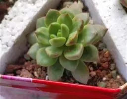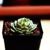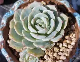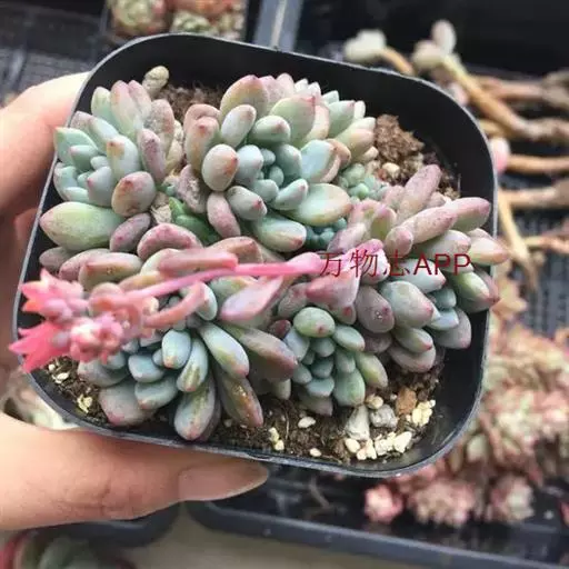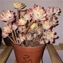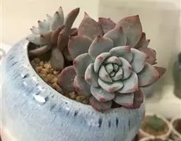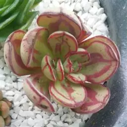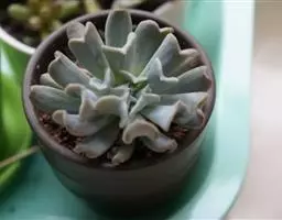 花乃井拟石莲花属多肉植物,植株小型或微型,直径在3-5厘米,叶片肉质肥厚,匙形,有短柄或无柄,轮生,排列紧密,形成莲座状,蓝绿色、或紫色、粉红色,叶片有白粉,叶端钝圆,有小尖,或几乎无尖。易生侧芽,从植株底部长出,容易长成群生株,花期春季。