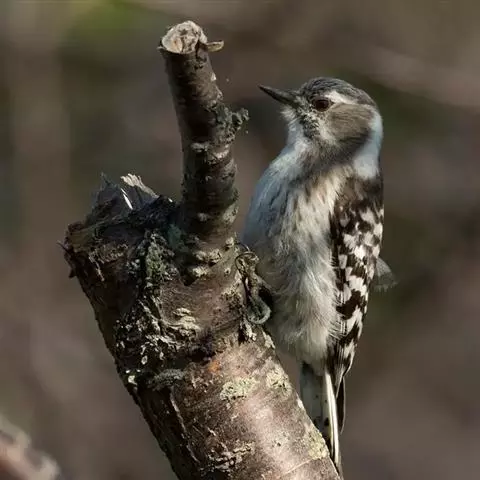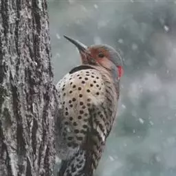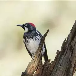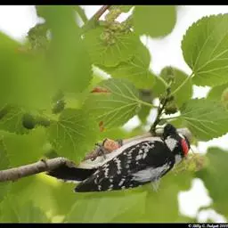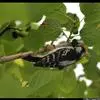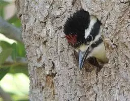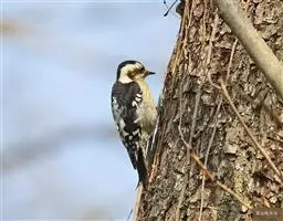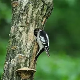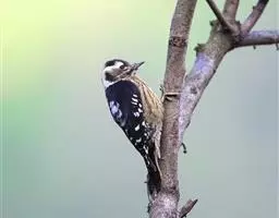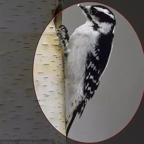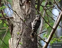 绒啄木鸟,北美洲最小的啄木鸟,白腹黑背和黑项,黑翼上有白色斑点。头部有黑白相间的条纹,尾巴短小,雄…