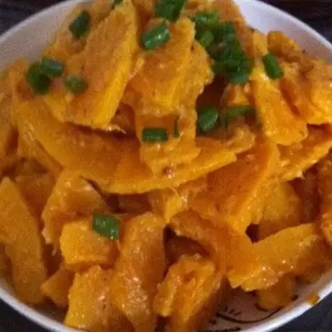 3.小葱切成段,放入油锅内爆香,下入苦瓜,迅速翻炒,与此同时,加入盐、糖,约炒1分钟后,加入味精,翻炒半分种熄火,淋上少量麻油,即可装盘。