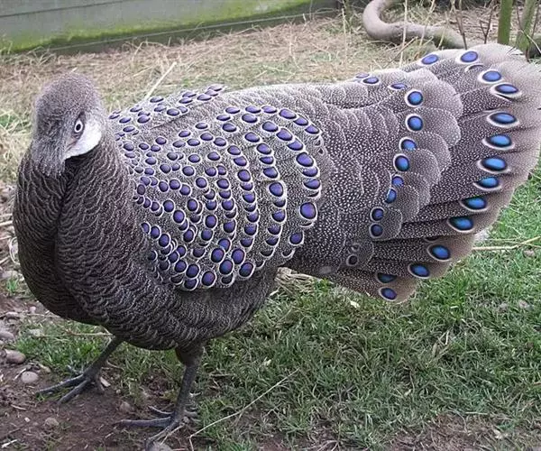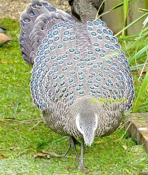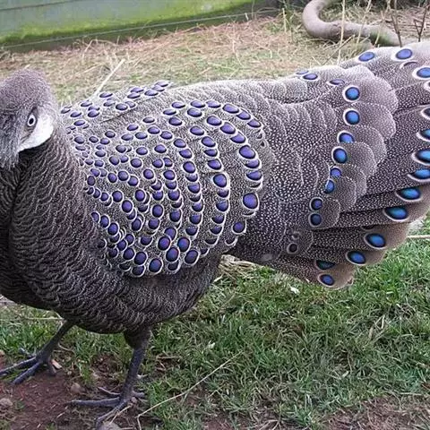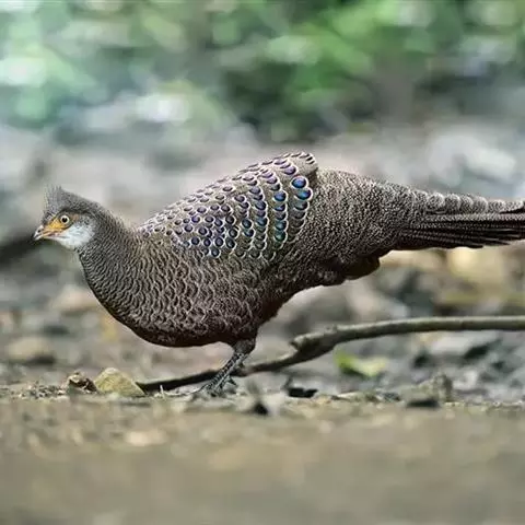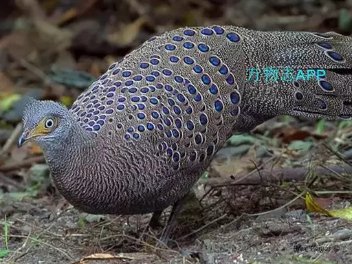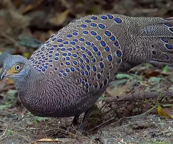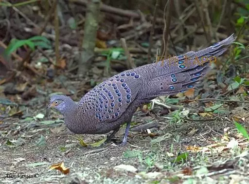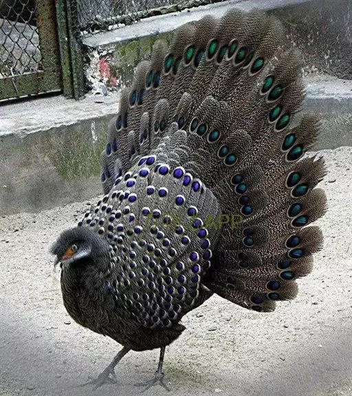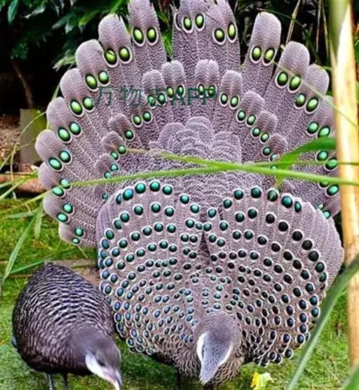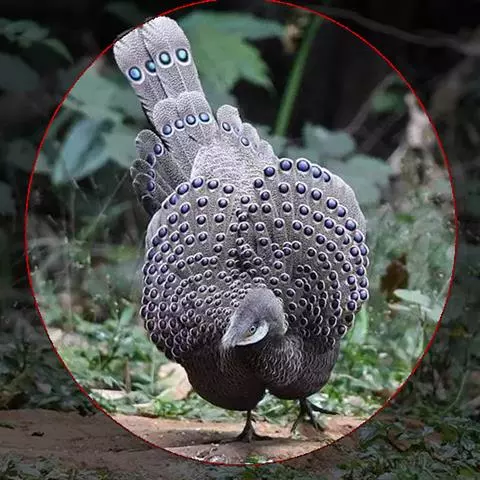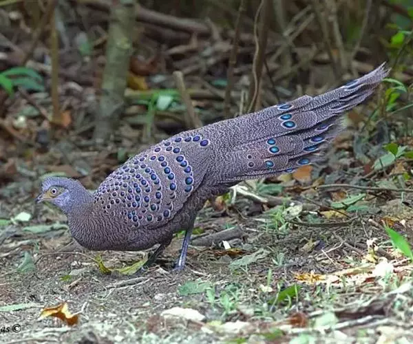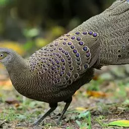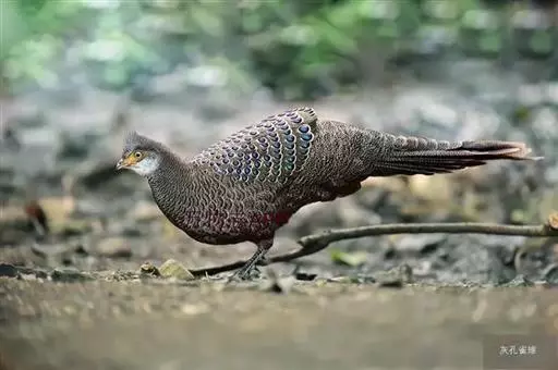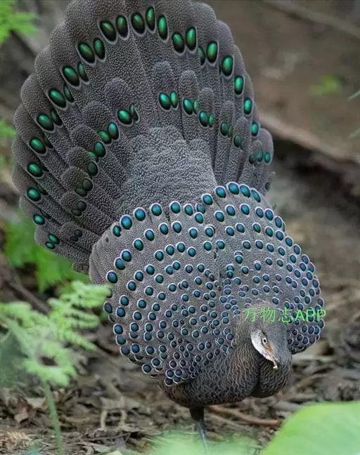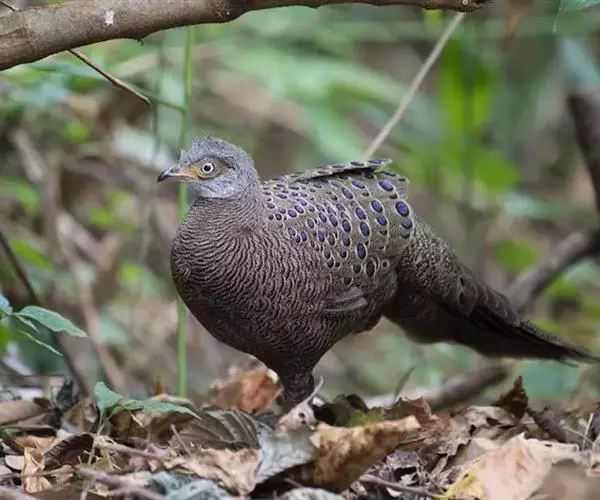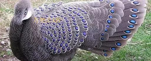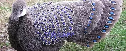灰孔雀雉(学名:Polyplectron bicalcaratum):雄鸟体长50-67厘米,体重456-710克;雌鸟体长33-52厘米,体重460-500克。雄鸟全身羽毛黑褐色,密布几乎纯白色的细点和横斑;上背、翅膀和尾羽端部具紫色或翠绿色金属光泽的绚丽的眼状斑,象孔雀羽毛上的孔雀斑一样,故名之。雌鸟体型较小,尾羽稍短,体色与雄鸟相似而较暗,眼状斑不明显。