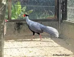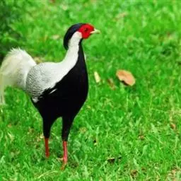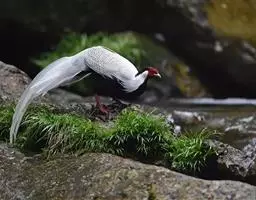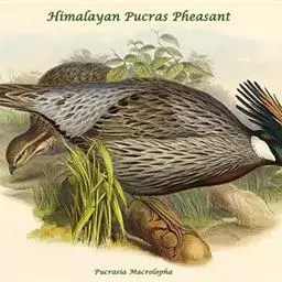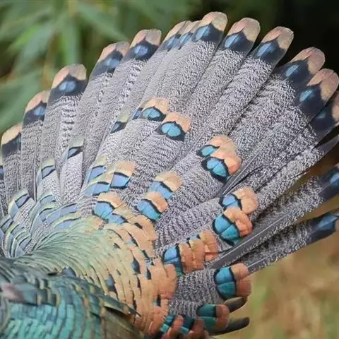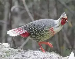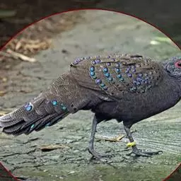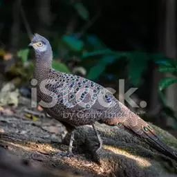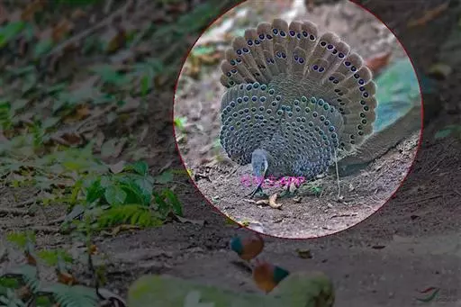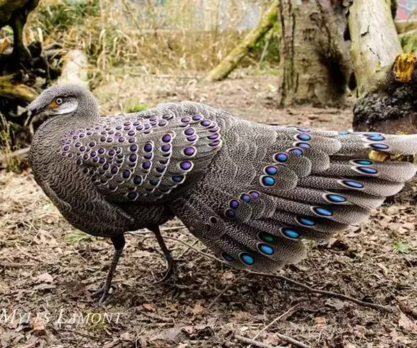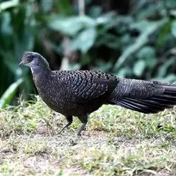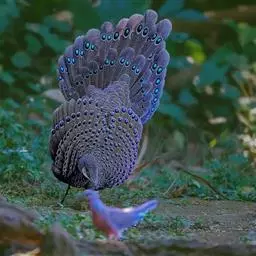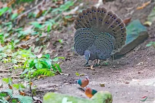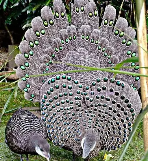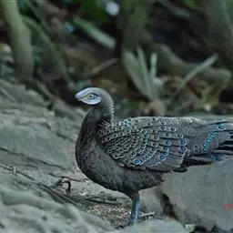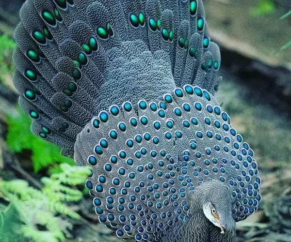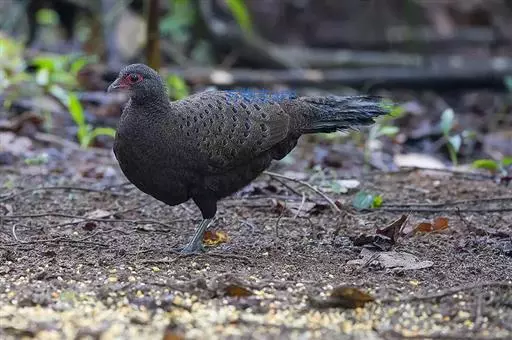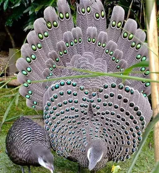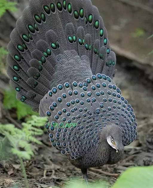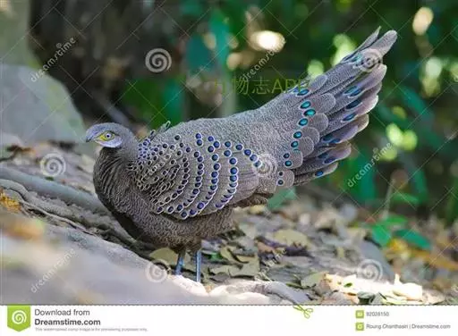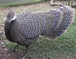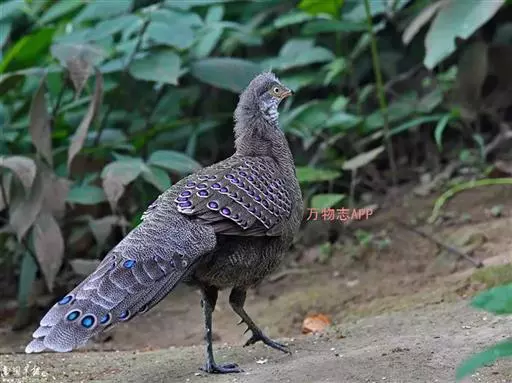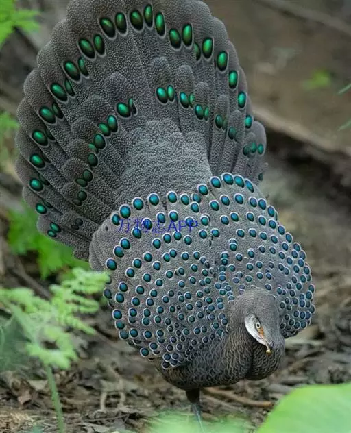 灰孔雀雉(学名:Polyplectron bicalcaratum):雄鸟体长50-67厘米,体重456-710克;雌鸟体长33-52厘米,体重460-500克。雄鸟全身羽毛黑褐色,密布几乎纯白色的细点和横斑;上背、翅膀和尾羽端部具紫色或翠绿色金属光泽的绚丽的眼状斑,象孔雀羽毛上的孔雀斑一样,故名之。雌鸟体型较小,尾羽稍短,体色与雄鸟相似而较暗,眼状斑不明显。