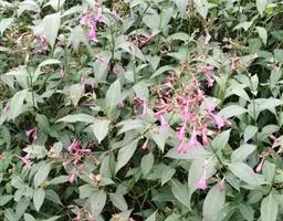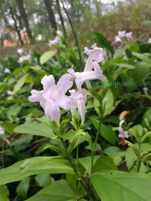 花: 花无梗,对生,组成腋生或顶生的穗状花序,长10-30厘米;苞片对生,叶状,长1.5-2.5厘米,具短柄,最下部的比花萼长。最下部小苞片比花萼稍短;花萼不等5深裂,裂片线形,后裂片较大;花冠堇、玫瑰红或白色,花冠圆筒形,顶端内弯,喉部扩大呈窄钟形,稍弯曲,不扭弯,花冠筒短圆柱形,喉窄钟形,长为花冠筒的两倍,支撑花柱的毛排列成2列,冠檐5裂,裂片等大,倒心形,旋转状排列;雄蕊2长2短,内藏;子房上半部被毛,每室有胚珠2粒,花柱无毛。