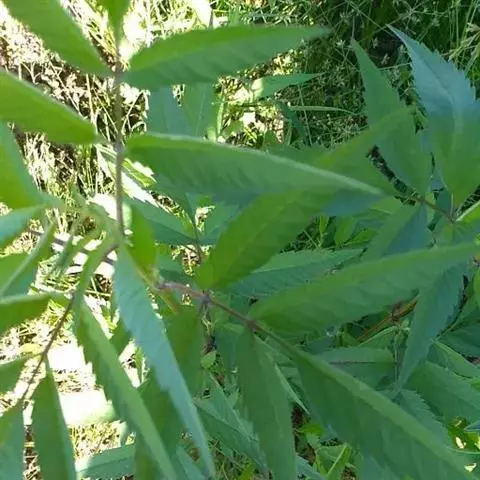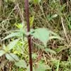 茎下部叶较小,3裂或不分裂,通常在开花前枯萎,中部叶具长1.5~5厘米无翅的柄,三出,小叶3枚,很少为具5 (-7) 小叶的羽状复叶,两侧小叶椭圆形或卵状椭圆形,长2-4.5厘米,宽1.5-2.5厘米,先端锐尖,基部近圆形或阔楔形,有时偏斜,不对称,具短柄,边缘有锯齿、顶生小叶较大,长椭圆形或卵状长圆形,长3.5-7厘米,先端渐尖,基部渐狭或近圆形,具长1-2厘米的柄,边缘有锯齿,无毛或被极稀疏的短柔毛,上部叶小,3裂或不分裂,条状披针形。