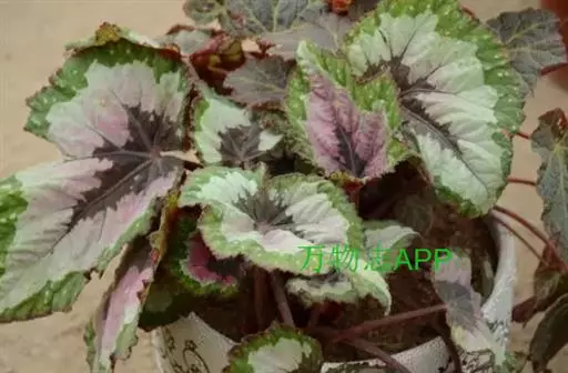 蟆叶海棠(学名:紫叶秋海棠,拉丁学名:Begonia rex Putz.)为秋海棠科秋海棠属多年生草本植物。高17-23厘米。根状茎圆柱形,呈结节状,周围长出密集细长之根。叶均基生,具长柄,花2朵,生于茎顶,蒴果3翅,一翅特大,呈宽披针形。产云南、贵州、广西。生于山沟岩石上和山沟密林中,海拔990-1100米。越南北部、印度东北部和喜马拉雅山区也有分布。