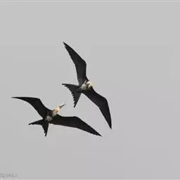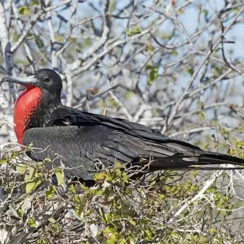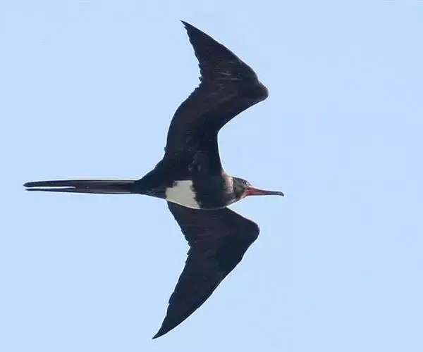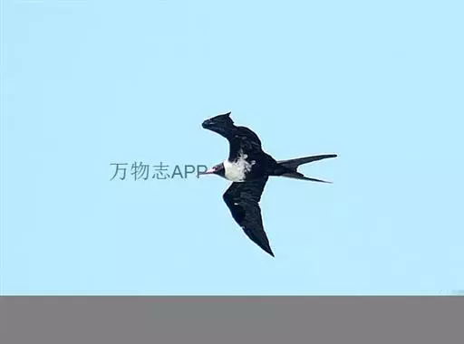 阿岛军舰鸟 阿岛军舰鸟体形轻盈,翼展宽阔,善展翅滑翔。和其他军舰鸟一样:有很长的深叉形尾巴,嘴尖弯曲成钩状,尖翅显著。 阿岛军舰鸟大型海鸟,体长89~96厘米。成年雄鸟全身黑色,且具绿色和紫色的油亮光泽。喉囊鲜红色,求偶期会鼓胀如心形气球状。成年雌鸟偏锈棕色,尤其在颈、胸周围最为明显,某些个体的胸、腹部会出现白色斑块。 幼鸟与成年雌鸟外形相似,幼鸟头部白色是主要的区别特征。