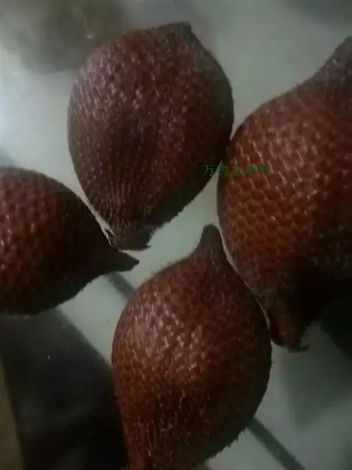 蛇皮果(学名:Salacca zalacca (Gaertn.) Voss)是棕榈科,蛇皮果属植物,植株相对较小,雌雄异株,叶羽状全裂,羽片披针形或线状披针形,呈“s”形或镰刀状;花序生于叶闻,总花序梗及分枝被包于宿存的佛焰苞内,花萼和花冠管状,花丝短,果实球形、陀螺形或卵球形,顶端具残留柱头,种子长圆形、球形或钝三棱形,味酸或甜,胚乳均匀、坚硬,胚基生。