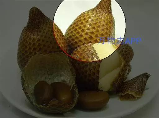功效:蛇皮果的果肉是白中带黄色,咬下去是很爽脆的感觉,而肉质很乾硬,非常的酸涩。蛇皮果果肉含对人体皮肤有益成分,印尼本地姑娘经常将它作为美容水果食用。它是水果中钾含量最高的品种之一,果胶含量也很丰富,对人脑十分有益,有“记忆之果”的美誉。