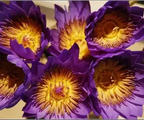 颜色种类有蓝色的,紫色的,粉红色的,金黄色的等。通常多数都是紫色的。睡火莲的花蕊大多数都是黄色或紫色的。