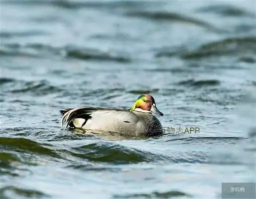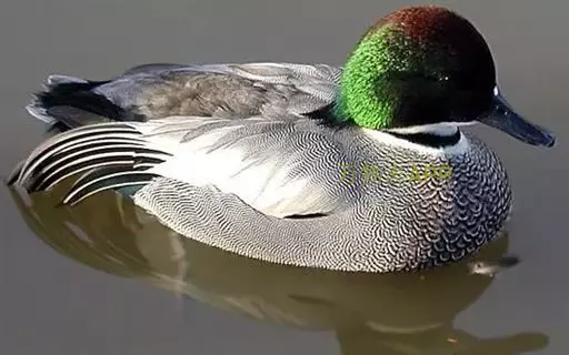 罗纹鸭(学名:Anas falcata)是中型鸭类,体型略较家鸭为小,体长40-52厘米,体重0.4-1千克。雄鸭繁殖期头顶暗栗色,头侧、颈侧和颈冠铜绿色,额基有一白斑;颏、喉白色,其上有一黑色横带位于颈基处。三级飞羽甚长,向下垂,呈镰刀状;下体满杂以黑白相间波浪状细纹;尾下两侧各有一块三角形乳黄色斑。明显有别于其他鸭类,野外容易鉴别。雌鸭略较雄鸭小,上体黑褐色,满布淡棕红色‘U’形斑。下体棕白色,满布黑斑。主要以水藻、水生植物嫩叶、种子、草子、草叶等植物性食物为食。繁殖在西伯利亚东部、远东、中国黑龙江省和吉林省。越冬在中国、朝鲜、日本、中南半岛、缅甸、印度北部。
