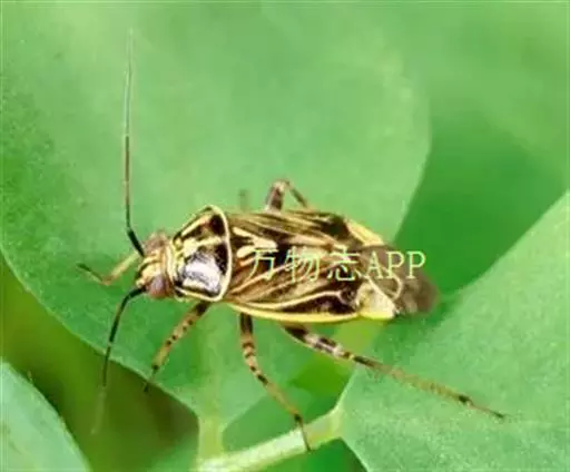 牧草盲蝽 体长6.5mm,宽3.2mm。全体黄绿色至枯黄色,春夏青绿色,秋冬棕褐色,头部略呈三角形,头顶后缘隆起,复眼黑色突出,触角4节丝状,第2节长等于3、4节之和,喙4节。前胸背板前缘具横沟划出明显的“领片”,前胸背板上具桔皮状点刻,两侧边缘黑色,后缘生2条黑横纹,背面中前部具黑色纵纹2—4条,小盾片三角形,基部中央、革片顶端、楔片基部及顶端黑色,基部中央具2条黑色并列纵纹。前翅膜片透明,脉纹在基部形成2翅室。足具3个跗节,爪2个,后足财节2节较1节长。