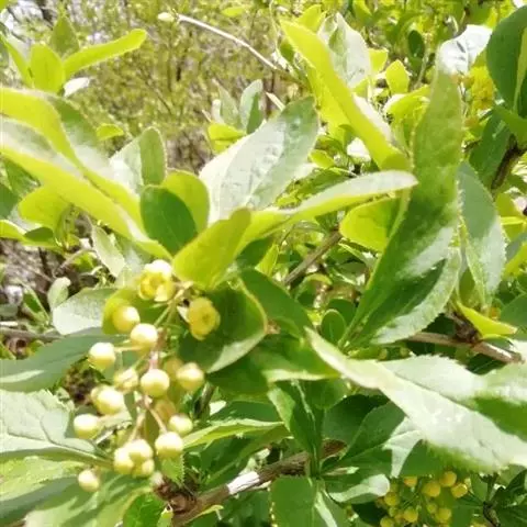 落叶灌木,高1 .5-2米。幼枝紫褐色,老枝灰黄色,具条棱,无疣点;茎刺单生,偶有三分叉,长1-4厘米,腹面具槽。叶薄纸质,长圆状菱形,长3.5-8厘米,宽1.5-4厘米,先端急尖,短渐尖或微钝,基部楔形,渐狭下延,上面暗黄绿色,中脉稍隆起,侧脉显著,孤曲斜上至近叶缘连结,背面灰白色,中脉和侧脉明显隆起,叶缘平展,全缘,有时稍呈波状;叶柄长1-2厘米。总状花序具3-15朵花,长2-5厘米,包括总梗长1-2厘米;花梗细弱,长4-8毫米,无毛;苞片披针形,先端渐尖,长1-1. 5毫米;花黄色;萼片2轮,外萼片长圆状卵形,长1.5-2毫米,宽1-1. 2毫米,先端急尖,内萼片长圆状倒卵形,长约4毫米,宽1-1.8毫米,先端钝;花瓣椭圆状倒卵形,长3-3.5毫米,宽1-1.8(-2.5)毫米,先端钝,全缘,基部缢缩呈爪,具2枚分离长圆形腺体;雄蕊长约3毫米,药隔先端不延伸,钝形;胚珠单生,无柄。浆果长圆状椭圆形,长8-12毫米,直径3-4.5毫米,熟时红色,顶端不具宿存花柱,不被白粉。花期4-5月,果期6-10月。