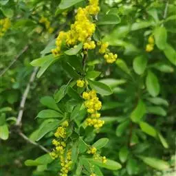 庐山小檗(学名:Berberis virgetorum Schneid.)是小檗科,小檗属落叶灌木,高可达2米。幼枝紫褐色,老枝灰黄色,茎刺单生,偶有三分叉,叶薄纸质,长圆状菱形,叶缘平展,有时稍呈波状;总状花序,花梗细弱,无毛;苞片披针形,花黄色;外萼片长圆状卵形,内萼片长圆状倒卵形,花瓣椭圆状倒卵形,浆果长圆状椭圆形,熟时红色,花期4-5月,果期6-10月。