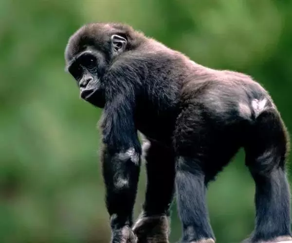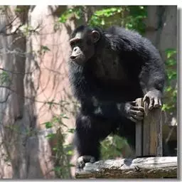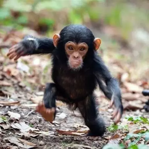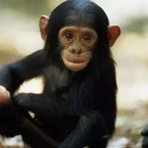 黑猩猩(学名:Pan troglodytes):人科 ,体长70-92.5厘米,站立时高1-1.7米,体重雄性56-80千克,雌性45-68千克;身体被毛较短,黑色,通常臀部有1白斑,面部灰褐色,手和脚灰色并覆以稀疏黑毛;幼猩猩的鼻、耳、手和脚均为肉色;耳朵特大,向两旁突出,眼窝深凹,眉脊很高、头顶毛发向后;手长24厘米;犬齿发达,齿式与人类同;无尾。