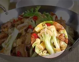 5.煎熬要拿准火候:掌握火候是回锅肉的关键。用中火,下肉片后,即下剁细的郫县豆瓣,混合熬炒,使豆瓣特有的色泽和味道深入肉中。火候油温拿捏得当的师傅,能把肉片熬制成一个一个的卷窝形状,俗称“灯盏窝”。肉片成窝时,立即放入甜面酱、酱油少许,也可适当放几滴料酒,放一点鸡精,以增加香味和鲜味,然后,马上加入配料,改为大火,翻炒至熟就可起锅。