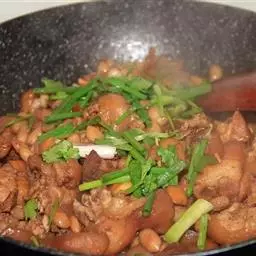 7、倒入青蒜,料酒、盐、糖、生抽,翻炒均匀即可。