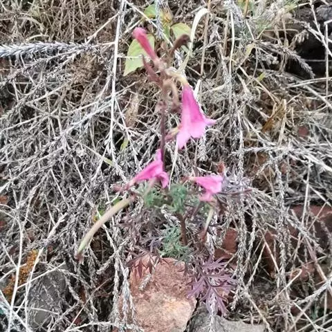 一年生至多年生草本,具分枝的茎,高达80厘米。根近木质而分枝。叶互生;叶柄长1~3厘米;叶片二至三回羽状细裂,小叶不规则细裂,末回裂片线状披针形,具细齿或全缘。顶生总状花序,疏散,长达20厘米;花梗长1~5毫米;小苞片绿色,线形,长3~5毫米;花萼钟状,绿色带紫红色,长、宽均约5毫米,萼齿间皱褶2浅裂;花冠淡玫瑰色或粉红色,有时带紫色,钟状漏斗形,先端5裂,裂片圆形;雄蕊4,2强,花药成对靠合;子房上位,2室,柱头2裂。蒴果淡绿色,细圆柱形,先端尾状渐尖,长3.5~ 5.5厘米,粗约5毫米:种子扁圆形,细小,直径约2毫米,四周具透明的膜质翅,先端具缺刻。花期5~9月,果期10~ 11月 。