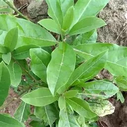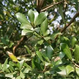 叶散生,叶片卵状长圆形,长2.5-5.5厘米,宽1-2.2厘米,先端钝或短渐尖,基部楔形或钝。薄革质,上面绿色,光亮,无毛,下面粉绿色,无毛,羽状脉,侧脉每边通常3-4条,中脉、侧脉在叶上面下陷,下面突起;叶柄粗短,长3-5毫米,初时有柔毛,以后毛脱落变无毛。