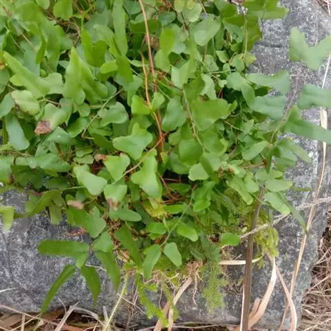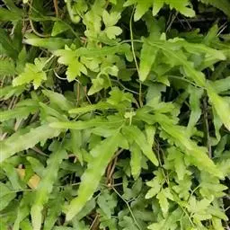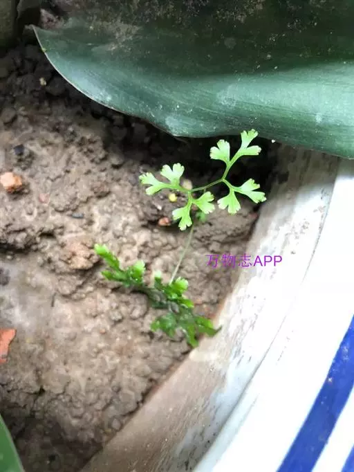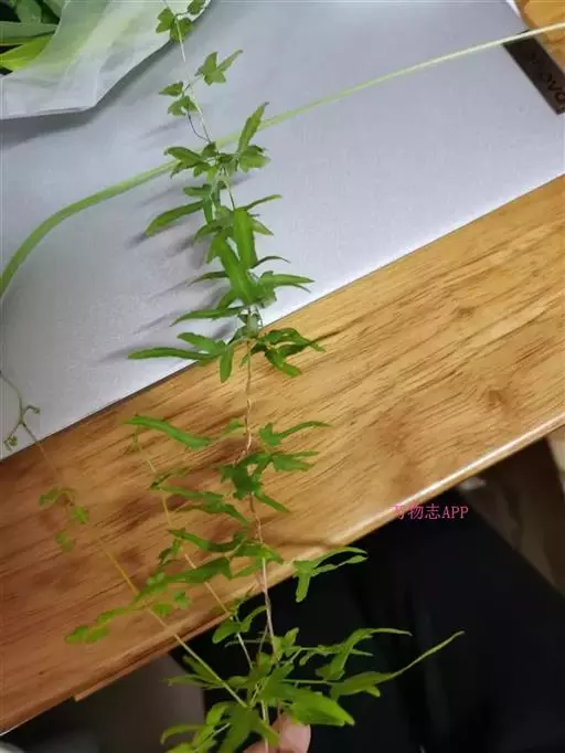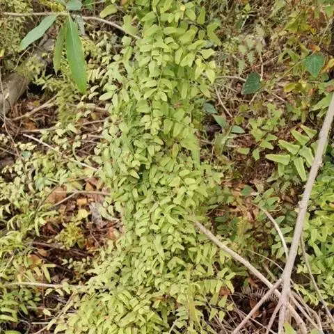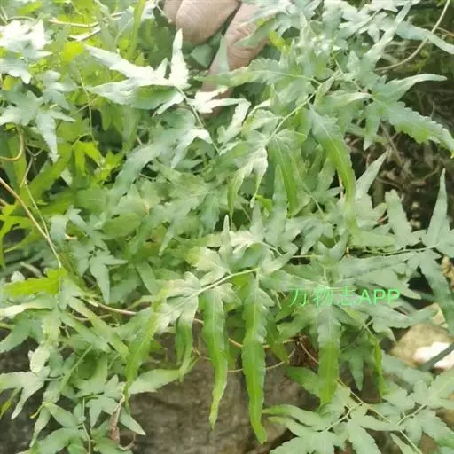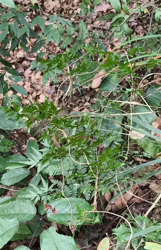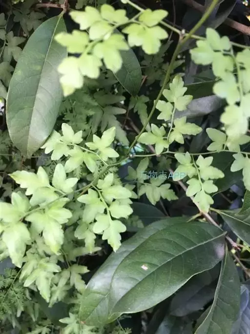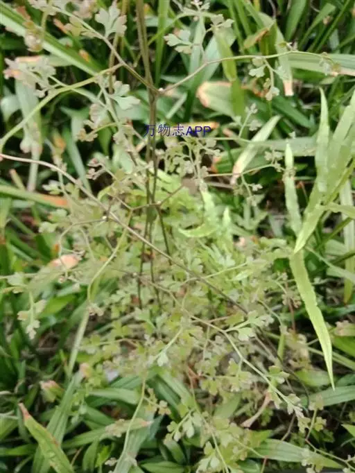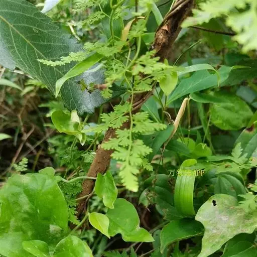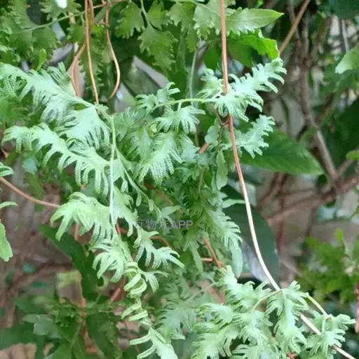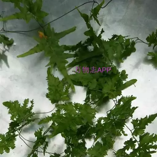 多年生草质藤本,长1~5m。根状茎横走,生黑褐色有节的毛;根须状,黑褐色,坚韧,亦被毛。叶多数,对生于茎上的短枝两侧,二型,纸质,连同叶轴和羽轴有疏短毛:营养叶尖三角形,长、宽各10~300px,二回羽状,小羽片掌壮或3裂,宽3~8mm,边缘有不整齐的细钝锯齿,孢子叶卵状三角形,长、宽各10~500px,多收缩而呈深撕裂状。夏末,小羽片下面边缘生流苏状的孢子囊穗,穗长2~5mm,黑褐色,孢子表面有小疣。