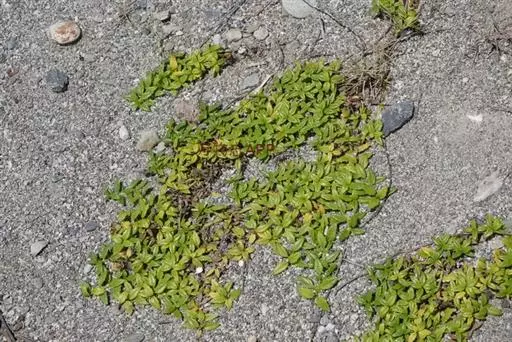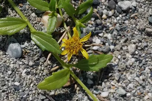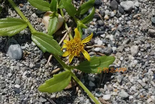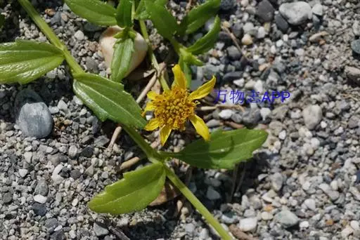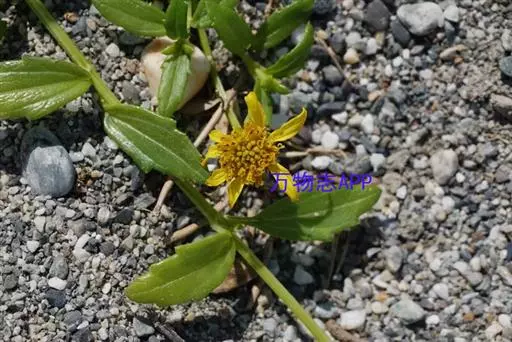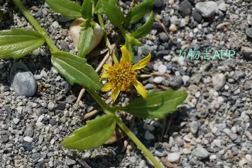 一年生草本。茎匍匐,长25~80cm或更长;基部茎节生不定根,节间长2~4cm,或在上部可达6~8cm;茎圆形,密被短糙毛,糙毛有时成钩状。叶对生;叶无柄或有1~5mm长短柄;叶片披针形或长圆状披针形,连叶柄长1~4cm,宽4~9mm,先端钝,基部稍狭,边缘有1~3对不规则粗齿或细齿,稀全缘,两面密被基部为疣状的短糙毛,中脉和近基发出的1对侧脉,不明显,无网状脉。头状花序少数,径约10mm,单生茎顶或上部叶腋,无花序梗或有长1~6mm花序梗;总苞近球形,径约9mm;总苞片2层,外层叶质,绿色,卵形至卵状长圆形,长4~6mm,先端钝或略尖,内层倒卵形或倒卵状长圆形,长约6mm,先端三角状短尖;托片折叠成倒卵状长圆形,长6~7mm,基部较狭,先端短尖;舌状花1层,黄色,舌片长圆形,长7~9mm,宽约3mm,先端3浅裂,管部约与子房等长;管状花黄色,长6~7mm,向上渐扩大成钟状,檐部5裂,裂片近三角形,先端稍钝,疏被短毛。瘦果倒卵状三棱形,长约4mm,宽2.5~3mm,先端截平,但中央稍凹入,凹入处密被短毛;无冠毛及冠毛环。花期6~10月。