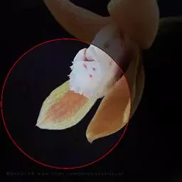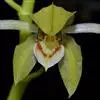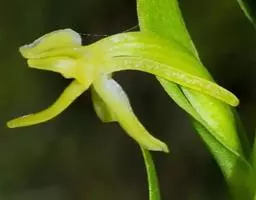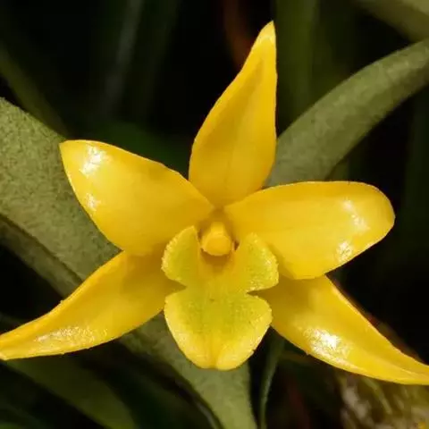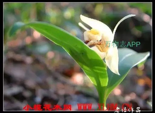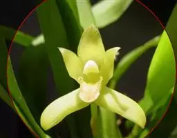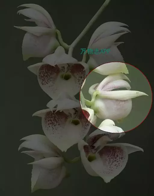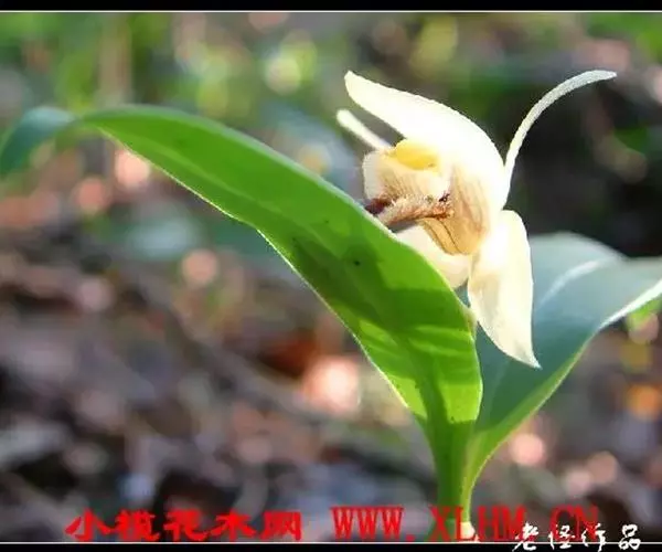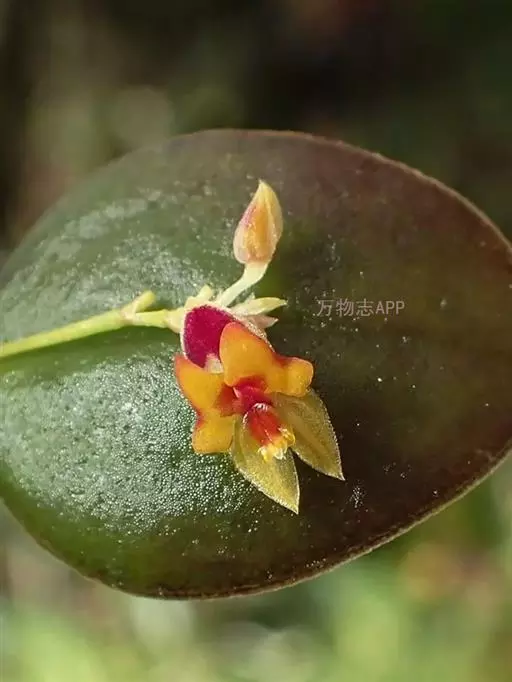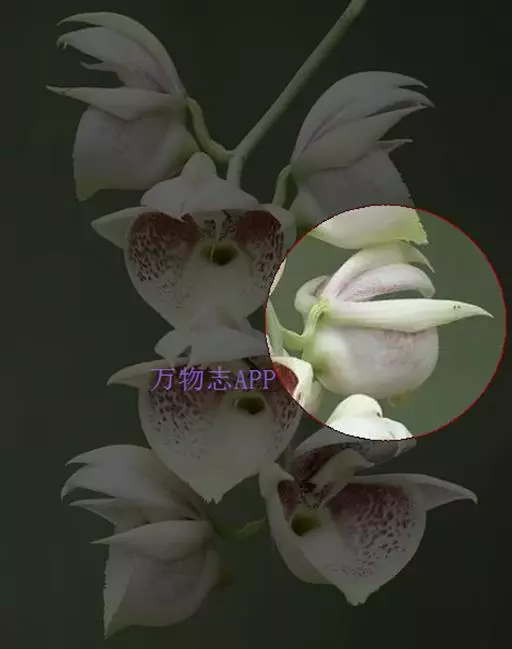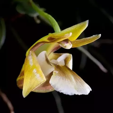 花葶从已长成的假鳞茎顶端发出,长5-10厘米,基部套叠有数枚圆筒形的鞘;鞘紧密围抱花葶;总状花序通常具1-2朵花,但同一时间只有1朵开放;花序轴顶端为数枚白色苞片所覆盖;花苞片早落;花梗和子房长1-1.2厘米;花淡黄色或近白色,仅唇瓣上有红色斑纹;萼片长圆状披针形,长1.6-2厘米,宽4-7毫米。