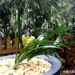 上盆(或翻盆)时间一般在春季3-4月或秋季10-11月。花盆以口小、盆深、底孔大的为佳。新从山上挖来的野生苗需理植于瓦盆(泥盆)中,这样兰花泥易干,通气性好.容易发根;2-3年后方可换人紫砂盆或瓷盆。兰花种植(在盆中)的方法与一般花卉不同,尤其是名种兰花,翻种移盆必须洗根。方法足将根浸入清水中,用旧牙刷或毛笔轻轻洗刷,切勿用力过大伤根;用剪刀将残叶、黄叶、断裂根、发黑腐烂根剪去,注意勿伤幼芽。然后将处理好的植株放在阴凉通风处晾干,待根部发白并显细小皱纹柔软时,再植入盆中。