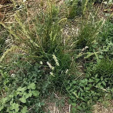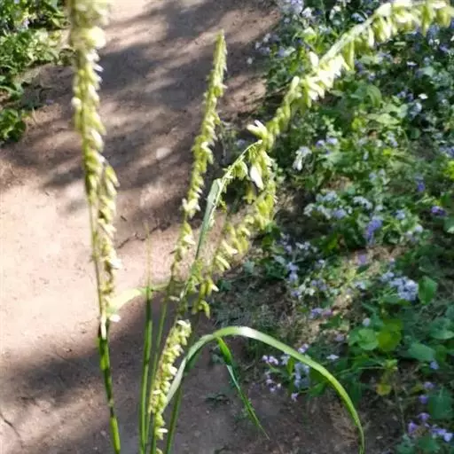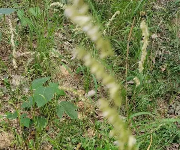 圆锥花序狭窄,长8-22厘米,宽1-2厘米;分枝直立或斜向上升,主枝长达5厘米;小穗柄短,纤细,上部弯曲,被微毛;小穗淡绿色或乳白色,长5-8毫米,含孕性小花2-4 (6)枚,顶端由数个不育外稃集成小球形;小穗轴节间长约1毫米,光滑;颖膜质,狭披针形,两颖几等长,长4-8毫米,具3-5脉,背面中脉常生微小纤毛;外稃草质,顶端尖或钝且为膜质,具7条隆起的脉,背面颖粒状粗糙,第一外稃长5-8毫米;内稃短于外稃或相等,倒卵形,顶端钝,具2脊,脊上被微小纤毛;雄蕊3,花药长约1.3毫米。颖果褐色,纺锤形,有光泽,长约1.5毫米。花果期5-8月。