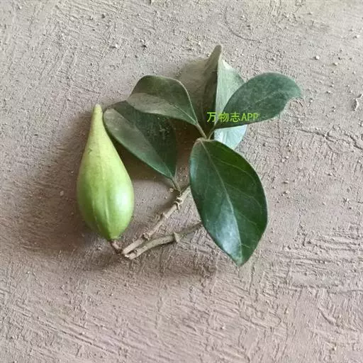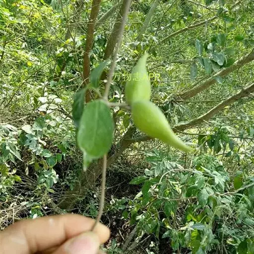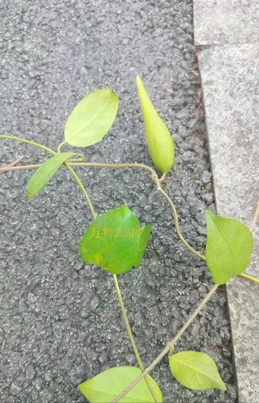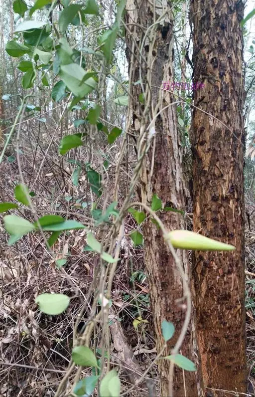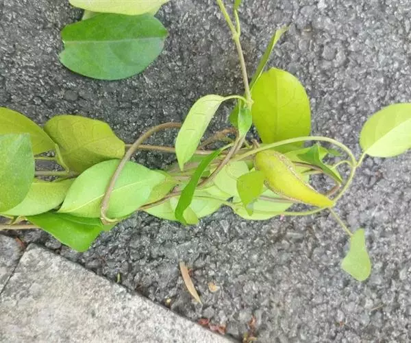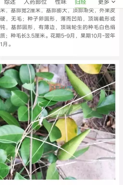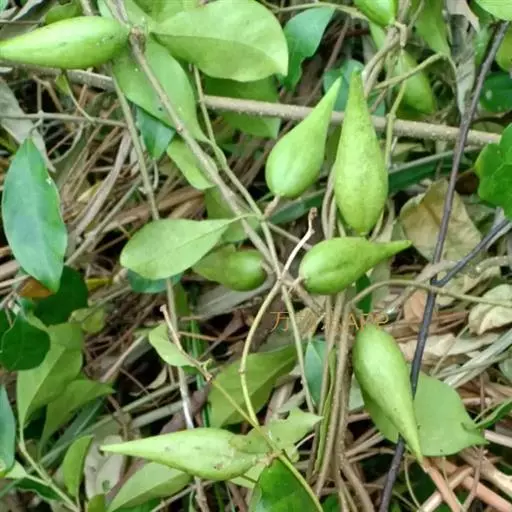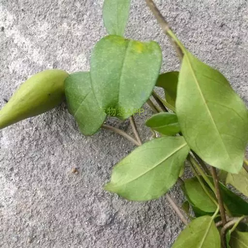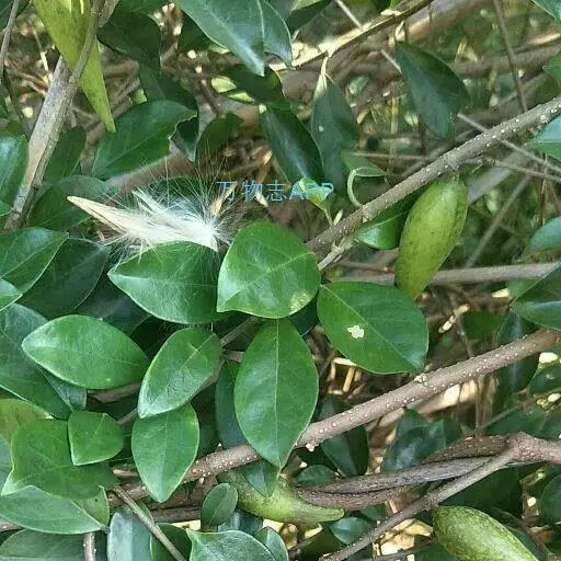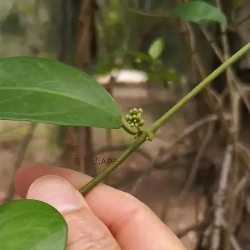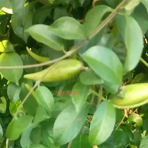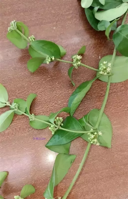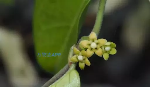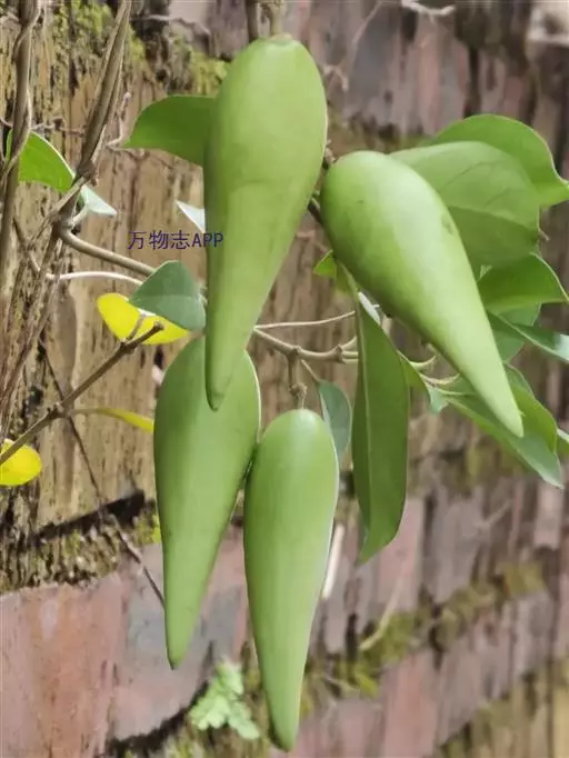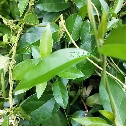 木质藤本,长达4米,具乳汁;茎皮灰褐色,具皮孔,幼枝被微毛,老渐无毛。叶倒卵形或卵状长圆形,长3-8厘米,宽1.5-4厘米,仅叶脉上被微毛;侧脉每边4-5条,弯拱上升;叶柄长3-10毫米,被短柔毛,顶端具丛生腺体。聚伞花序伞形状,腋生,比叶为短;花序梗长2-5毫米,被短柔毛;花梗长2-3毫米,纤细,被短柔毛;花小,绿白色,长和宽约2毫米;花萼裂片卵圆形,钝头,被缘毛,花萼内面基部有5个腺体;花冠绿白色,钟状,裂片卵圆形,钝头,略向右覆盖;副花冠着生于花冠裂片弯缺下,厚而成硬条带;雄蕊着生于花冠筒的基部;花药长圆形,顶端具膜片;花粉块长圆形,直立;柱头宽而短圆锥状,伸出花药之外。蓇葖卵状披针形,长5-9厘米,基部宽2厘米,基部膨大,顶部渐尖,外果皮硬,无毛;种子卵圆形,薄而凹陷,顶端截形或钝,基部圆形,有薄边,顶端轮生的种毛白色绢质;种毛长3.5厘米。花期5-9月,果期10月-翌年1月。