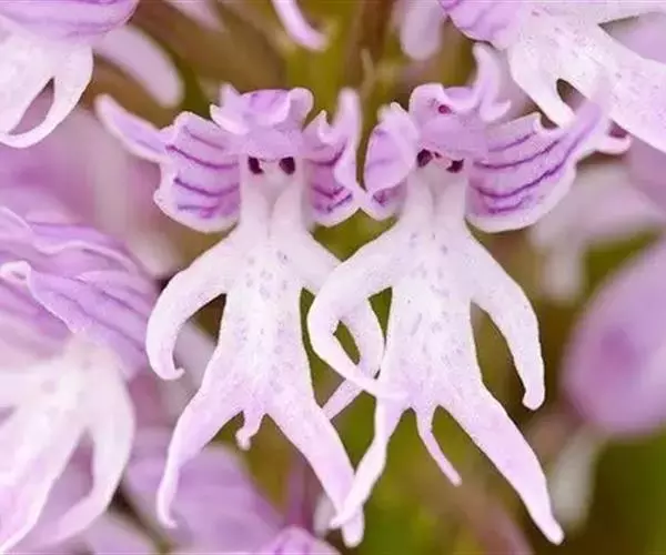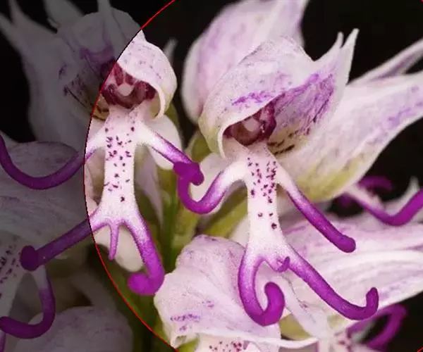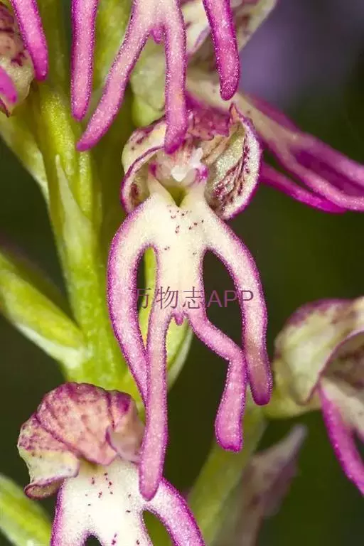 广布红门兰(学名:Orchis chusua D. Don):植株高5-45厘米。块茎长圆形或圆球形,肉质,不裂。茎直立,圆柱状。叶片长圆状披针形、披针形或线状披针形至线形,上面无紫色斑点。花序具1-20余朵花,多偏向一侧;花紫红色或粉红色;花瓣直立,斜狭卵形、宽卵形或狭卵状长圆形,长5-7毫米,宽3-4毫米,先端钝,边缘无睫毛,前侧近基部边缘稍臌出或明显臌出,具3脉;唇瓣向前伸展,较萼片长和宽多,边缘无睫毛,3裂。花期6-8月。