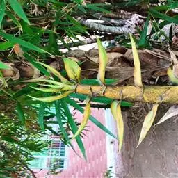 竿黄色,竿稍疏离,高8-15米,直径5-9厘米,尾梢下弯,下部挺直或略呈“之”字形曲折;节间正常,但具宽窄不等的绿色纵条纹,长20-30厘米,幼时稍被白蜡粉,并贴生以淡棕色刺毛,老则无粉无毛,竿壁稍厚;节处稍隆起,竿基数节具短气根,并于箨环之上下方各环生一圈灰白色绢毛;分枝常自竿下部节开始,每节数枝至多枝簇生,主枝较粗长。