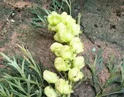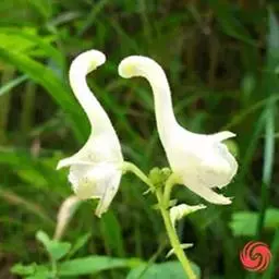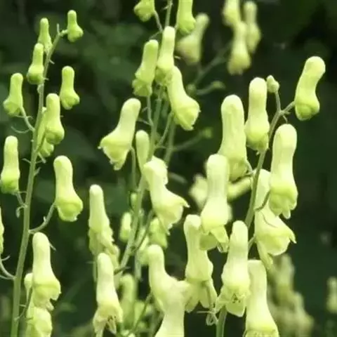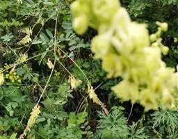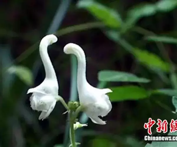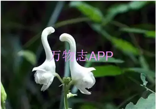 拟两色乌头 拟两色乌头属多年生草本花卉,毛茛科,群居而生,为蔓生植物,春天发芽、秋后枯黄。到了八月,枝蔓上便会冒出一串串花蕾,从蔓条的中部到顶尖依次绽放,花呈乳白色,花色不大,花冠分四瓣,花蕊朝下,上面一瓣最为怪异,花蕊相扣,背部细而带钩,形状像一只只展翅欲飞的天鹅,下面的一瓣生出两脚,极像天鹅腿,“天鹅花”也因此而得名。
