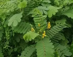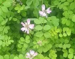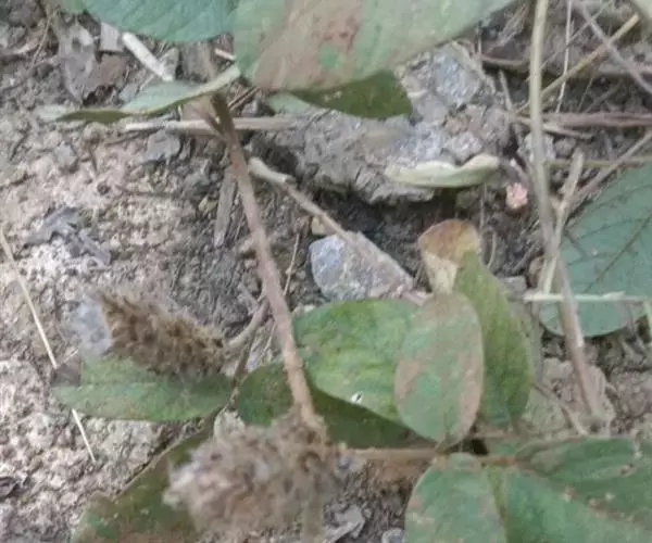 叶多为3小叶,稀兼有单小叶;托叶三角形,长3毫米,宽约1毫米,先端尾尖,被灰黄色长柔和缘毛;叶柄长1-2厘米,有沟槽;小叶纸质,顶生小叶近圆形或椭圆形至卵形,长2-6厘米,宽1.5-3厘米,先端圆形或微凹,有细尖,基部圆形或心形,侧生小叶较小,上面略粗糙,下面被灰黄色短柔毛,侧脉每边5-7条,直而斜展,靠叶缘处微弯拱,两面凸起,网脉在下面明显;小托叶刚毛状,长1.5毫米;小叶柄长约2毫米,密被灰黄色短柔毛。