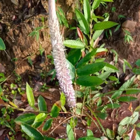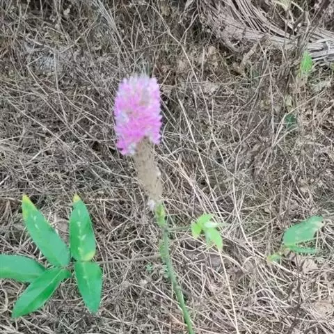 总状花序顶生,长3-6厘米,直径1.5-2厘米,花排列紧密;苞片宽卵形,长8-10毫米,先端锥尖,密被灰色毛和缘毛,开花时脱落;花梗长4毫米,疏被白色长柔毛;花萼5裂,上部二裂片三角形,较短,长约2毫米,下部3裂片刺毛状,较上部裂片长3倍以上,被白色长柔毛,萼筒长约1毫米;花冠长约6毫米,淡紫色,旗瓣倒卵形,基部渐狭;雄蕊二体;子房无毛,有胚珠1-2。
