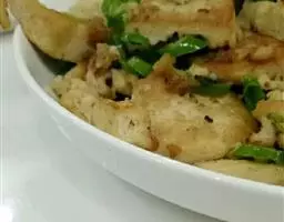 1、将4块豆腐切成16小块,先沾上面粉,再放入打散的蛋汁内沾均匀,最后沾上花迆鱼,备用。