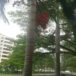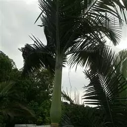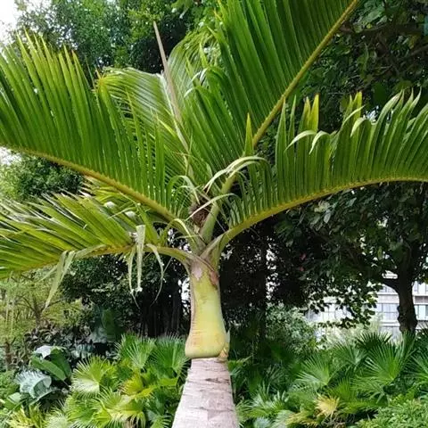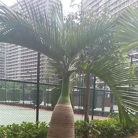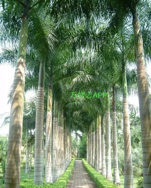 王棕(学名:Roystonea regia (H.B.K)O.F.Cook):又名大王椰子。乔木;单干,直立叶痕不明显,叶簇生于干顶,叶片大,长达3米以上,叶鞘长大,羽状全裂,羽叶狭长柔软,列序不甚整齐,深绿色。干粗壮雄伟,中下部膨大,呈佛肚状,径达40厘米以上,确为棕类之王,是显示热带壮丽风光的典型树种,