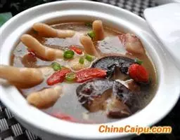 2、猪蹄洗净,放入锅中,放入生姜、绍酒和适量清水,以旺火煮开,改文火炖烂,加茭白片烧沸几分钟,加精盐调味即成。