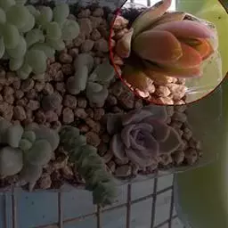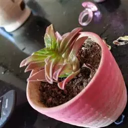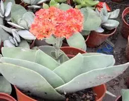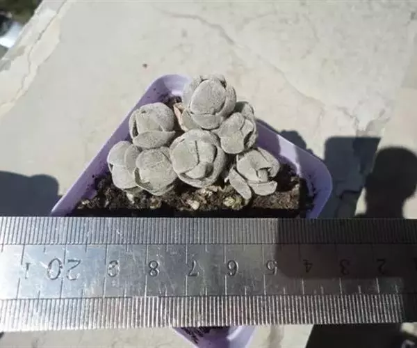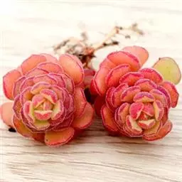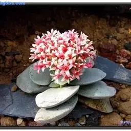 叶子表面宽厚,富肉质感且带有磨纱质感,看像石头质地;开红色小花,生于植株顶部,倒伞形密生,形状像花…