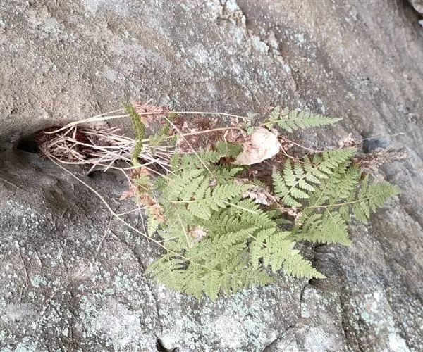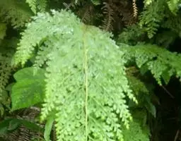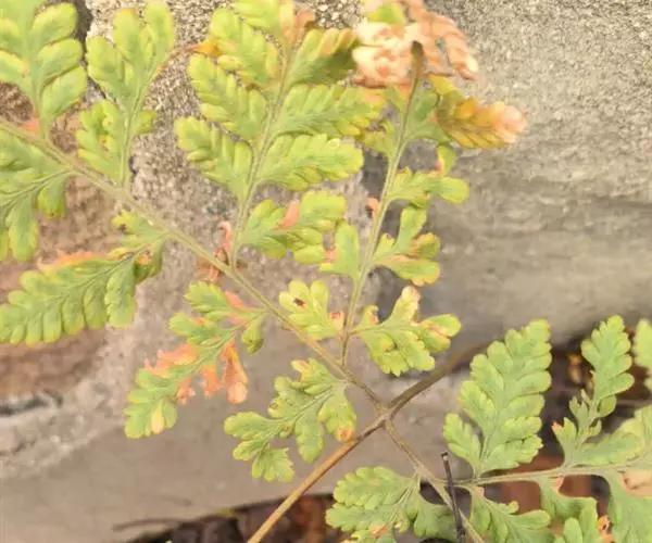 植株高(12-)20-50(-60)厘米。根状茎粗壮,横走,连同叶柄基部密被鳞片;鳞片长0.5-3厘米,狭披针形,先端渐狭成线形,全缘,膜质,亮红棕色。叶近生,柄长(5-)10-25(-30)厘米,粗1-3毫米,禾秆色,基部有时疏被较小的狭披针形鳞片,向上仅被灰白色柔毛;叶片长(7-)20-30厘米,基部宽(6-)18-30厘米,卵状五角形,先端渐尖并羽裂,基部圆心形,三回羽状;羽片8-12对,稍斜上,下部1-2对近对生,相距1.2-8厘米,向上互生;基部一对最大,长(3.5-)10-20厘米,基部宽(3-)5-10厘米,三角状长圆形,短渐尖头,基部心形,柄长(2-)5-10毫米,二回羽状;一回小羽片6-10对,上先出,互生,稍斜上,彼此接近,羽轴下侧的较上侧的为大,尤以基部一片最大,长(1.5-)3-7厘米,基部宽(1-)2-5厘米,卵状三角形,短渐尖头,基部近截形,下延成具狭翅的短柄,一回羽状;末回小羽片长(0.5-)1.5-2.5厘米,基部宽0.5-1厘米,长圆形,先端钝尖,基部多少与小羽轴合生,羽状深裂;裂片长圆形,先端圆钝,边缘全缘或略成波状;基部一对羽片的上侧小羽片长1-4厘米,基部宽0.5-2厘米,卵状三角形至长圆形,先端急尖,基部近平截,以狭翅下延,一回羽状深裂;第二对以上各对羽片向上渐次缩短,披针形或长圆披针形,先端短钝尖,基部圆截形或为浅心形,具短柄,二回羽裂;羽轴两侧的小羽片近等大。叶脉两面明显,侧脉羽状,单一,每末回裂片2-3对,斜上,伸达叶边;叶草质,干后黄绿色,两面连同叶轴和各回羽轴密被灰白色柔毛;羽轴下面偶有红棕色的线状披针形的狭鳞片。孢子囊群圆形,背生于侧脉中部,每裂片1-3枚;囊群盖大,肾形,浅灰色,膜质,背面密被柔毛,宿存。孢子深棕褐色,二面体形,单裂缝,赤道面观为肾形,极面观呈椭圆形,圆肾形,周壁具较密的褶皱,形成明显的弯曲条纹,表面光滑。孢子大小为46微米×56微米。 [2-3]