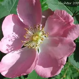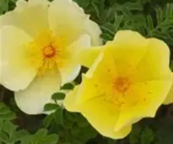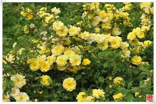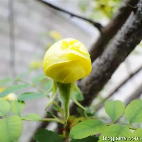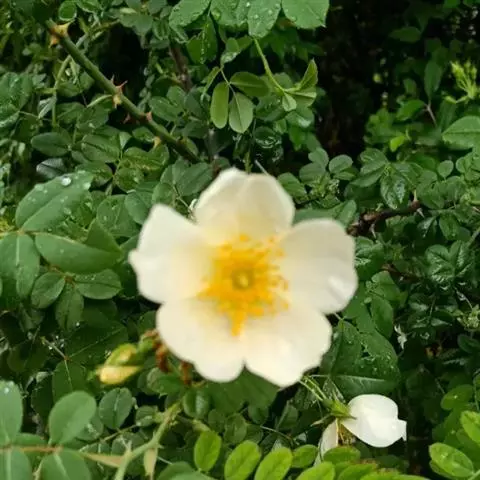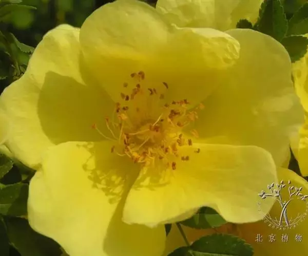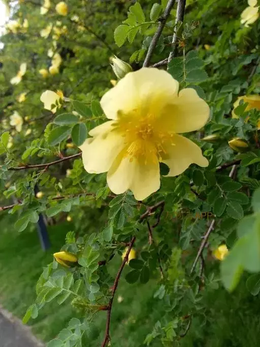 单瓣黄刺玫 是栽培黄刺玫的原始种。直立灌木,高2-3米;枝粗壮,密集,披散;小枝无毛,有散生皮刺,无针刺。小叶7-13,连叶柄长3-5厘米;小叶片宽卵形或近圆形,稀椭圆形,先端圆钝,基部宽楔形或近圆形,边缘有圆钝锯齿,上面无毛,幼嫩时下面有稀疏柔毛,逐渐脱落;叶轴、叶柄有稀疏柔毛和小皮刺;托叶带状披针形,大部贴生于叶柄,离生部分呈耳状,边缘有锯齿和腺。