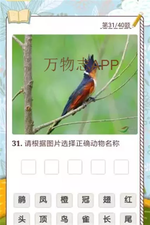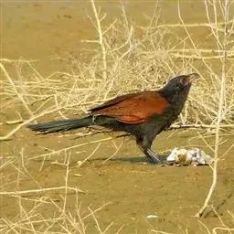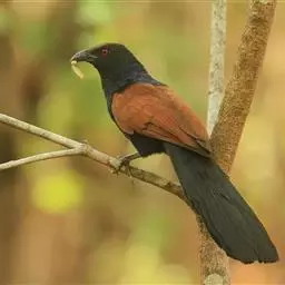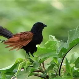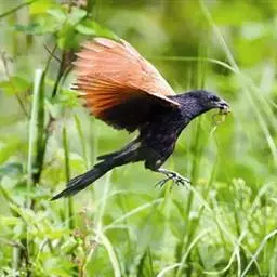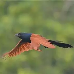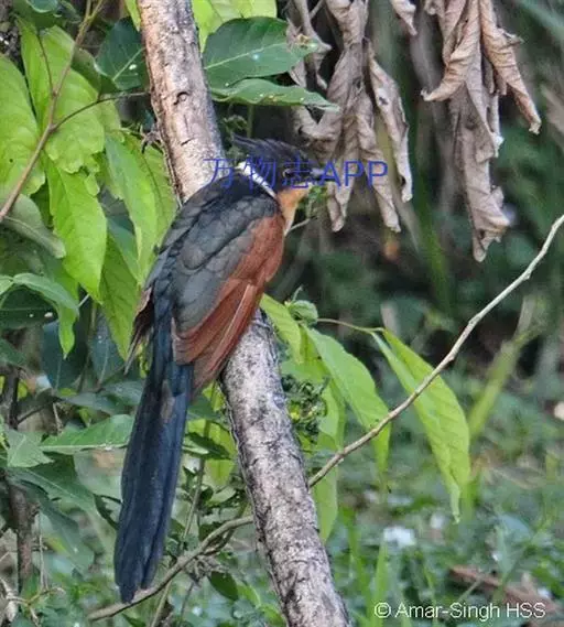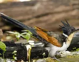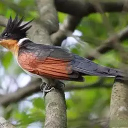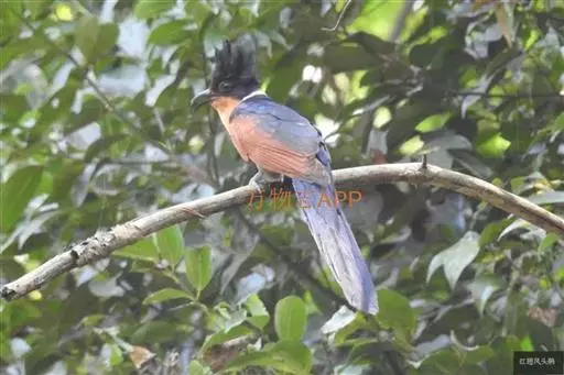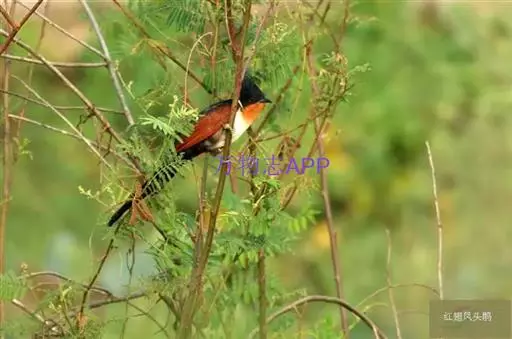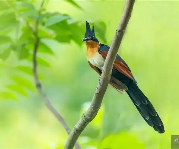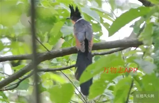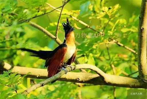 红翅凤头鹃(学名:Clamator coromandus):体长约38厘米,顶冠及凤头黑色,具显眼的直立凤头,背及尾黑色而带蓝色光泽,翅栗红色,喉及胸橙褐色,颈圈白色,腹部近白。虹膜淡红褐色。嘴黑色,下嘴基部近淡土黄色,嘴角肉红色,脚铅褐色。幼鸟上体褐色,具棕色端缘,下体白色。