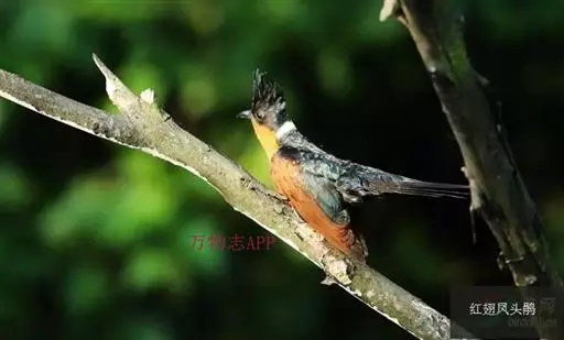 红翅凤头鹃:体长约38厘米,顶冠及凤头黑色,具显眼的直立凤头,背及尾黑色而带蓝色光泽,翅栗红色,…