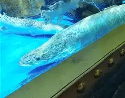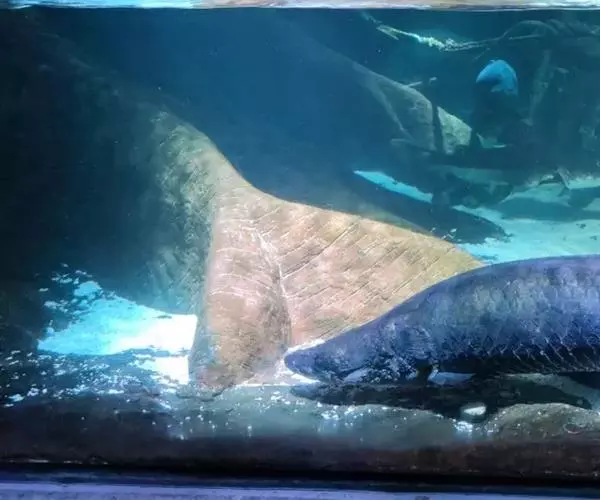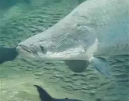 巨骨舌鱼(学名:Arapaima gigas):是巨骨舌鱼属(Arapaima)的物种,亦称海象鱼。成鱼体长可达2-6米,重可达100千克。体形巨大,长形,稍侧扁。头部骨骼由游离的板状骨组成。口大,无须。无下颌骨,舌上有坚固发达的牙齿。鳔四周富有血管,内表呈蜂窝状,常有特殊的鳃上器。鳞片大且硬,呈嵌镶状。背鳍和臀鳍位于体的后部,互为相对。胸鳍位低。腹鳍位腹部之后。尾鳍圆形。体灰绿色,背部颜色深,腹部较淡,尾鳍及体后部红色。