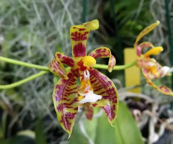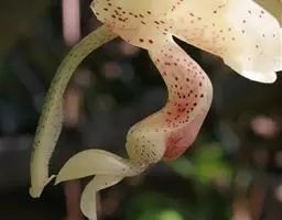 花期具叶;花序1-2个,侧生于茎,常斜出或下垂,不分枝或有时分枝,长5.5-30厘米,疏生少数至多数花;花序柄粗壮,长达11厘米,粗3-5毫米,被1-2枚苞片状的鞘;花苞片披针形,长6-10毫米,先端渐尖;花梗和子房长2-3厘米;花开展,质地厚,萼片和花瓣橘红色带紫褐色横纹斑块;中萼片倒卵状披针形,长15-18毫米,宽5-7毫米,先端锐尖,具6-7条脉;侧萼片斜卵状椭圆形,长15-18毫米,宽7-9毫米,先端急尖并且多少镰刀状弯曲,基部收狭而贴生在蕊柱足上,具6-7条脉;花瓣近长圆形,长13-15毫米,宽4-5毫米,先端锐尖,具3-5条脉;唇瓣白色,长约1厘米,基部具长约1毫米的爪,3裂;侧裂片直立,近长方形,长4毫米,宽2毫米,中部稍缢缩并且其内面中央隆起,先端斜截,基部(在两侧裂片之间)强烈增厚并且具1个先端2裂的肉质穴状物,而与中裂片的基部在背面隆起成半球形,在穴状物的前方具1枚直立而上部2裂呈触须状的附属物;中裂片厚肉质,锚状,先端圆钝,基部具1枚直立而两侧压扁的狭长附属物,边缘具不规则的细齿,上面近先端处增厚成半圆形紫色的垫状物,中央被稀疏的长毛和乳突;蕊柱除基部紫褐色外,其余黄色,长约8毫米,基部两侧各具1个近三角形的臂状物;蕊柱足长约4毫米;蕊喙狭长,下垂,长约2毫米,不裂;药帽黄色,半球形,前端半圆形,先端凹缺;花粉团2个,近椭圆形,每个为不等侧的半裂。花期3-4月。