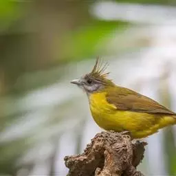 黄腹冠鹎:体长19-24厘米,是一种体型略大的褐色鹎。头顶橄榄褐色具黑褐色羽冠。白色的喉膨起,…