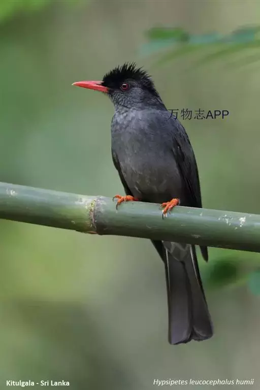 黑短脚鹎(学名:Hypsipetes madagascariensis):中型鸟类,体长22-26cm。嘴鲜红色,脚橙红色,尾呈浅叉状。羽色有两种色型,一种通体黑色,另一种头、颈白色,其余通体黑色。野外特征极明显,容易识别。