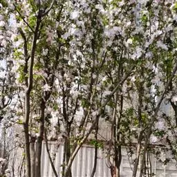 加工:垂丝海棠宜用棕丝攀扎,结合修剪进行造型。但须注意及时拆除棕丝,否则很易造成“陷丝”现象,影响美观和树木生长。加工时期以在休眠期为宜,亦可在开花后进行。 树形:垂丝海棠盆景树形宜作斜干式、曲干式和悬崖式等,枝干宜挺秀舒展,并注意疏密适当,以利花枝繁茂,花色娇艳,增加观赏效果。