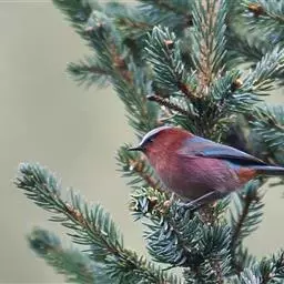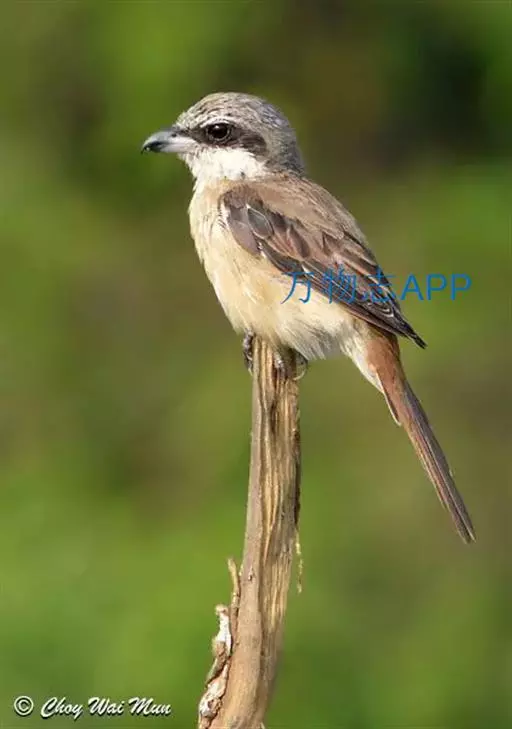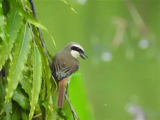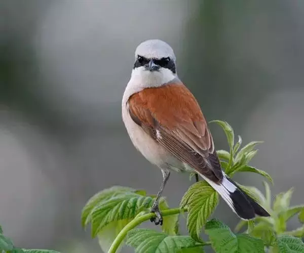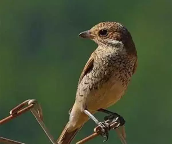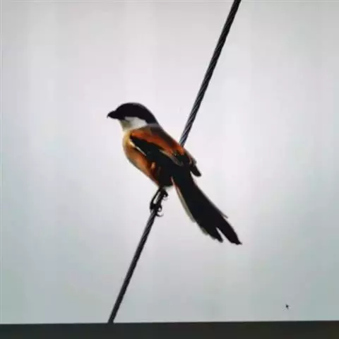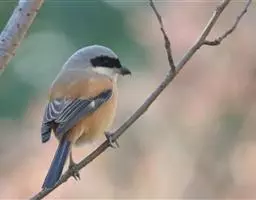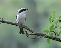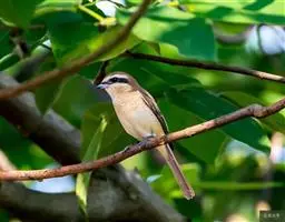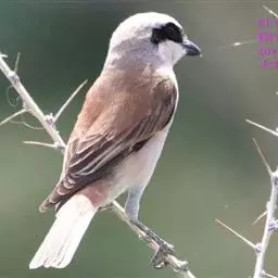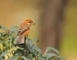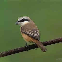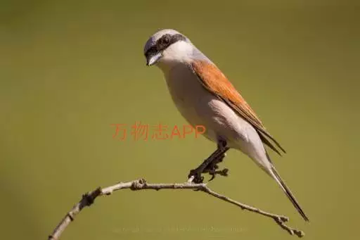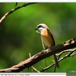 红尾伯劳 主要特点是额和头顶前部淡灰色,背面大部呈灰褐色,腹面棕白而无杂斑。头侧具穿过眼部的黑色宽带纹,尾羽呈棕红色。平时栖息于平原或山地的小树或灌木的顶枝上,性格凶猛,举目张望四周,一见有昆虫或其他食饵,即急飞直下而抓住它,然后再返回所栖的树枝上。性贪食。鸣声粗厉响亮,叫时仰首翘尾,激昂有力。营巢活动自 5月下旬至 7月中旬 ,两性参与筑巢 ,营巢期间有求偶交配行为 ,营巢期 6~ 8d。理巢基本全由雄鸟承担,护巢性强。 巢呈粗大的杯状,由草茎、草根、草穗及梗等编成。巢大多建在阔叶树上,每窝产4~6枚乳白色卵,上面密布有深浅不一的蓝灰和黄褐色斑点。